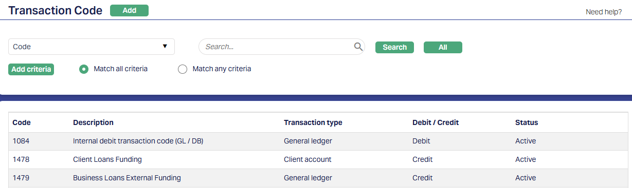 - Access General Ledger from menu, click Settings and then Transaction code. Transaction Code Search page appears. All Transaction codes available in Aura get displayed.