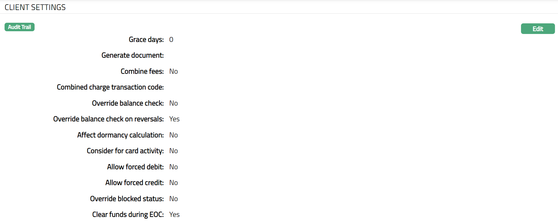 Select appropriate radio button for Override balance check on reversals. Override balance check on reversals denotes whether the transaction can be processed by overriding the balance check during reversal -- that is when client account does not have sufficient balance.