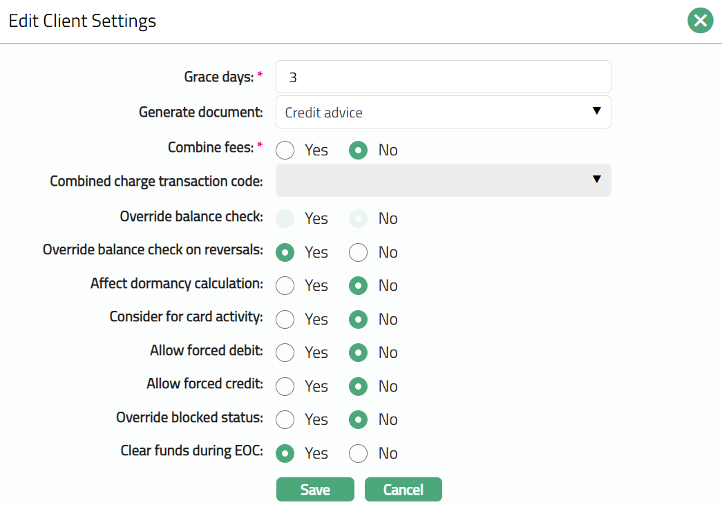 Select appropriate option for Allow forced debit. Allow forced debit denotes whether the transaction can be posted to client account even if Disallow debit is set as Yes at the client account. If the option is checked then AuraAura will allow you to debit the client account.