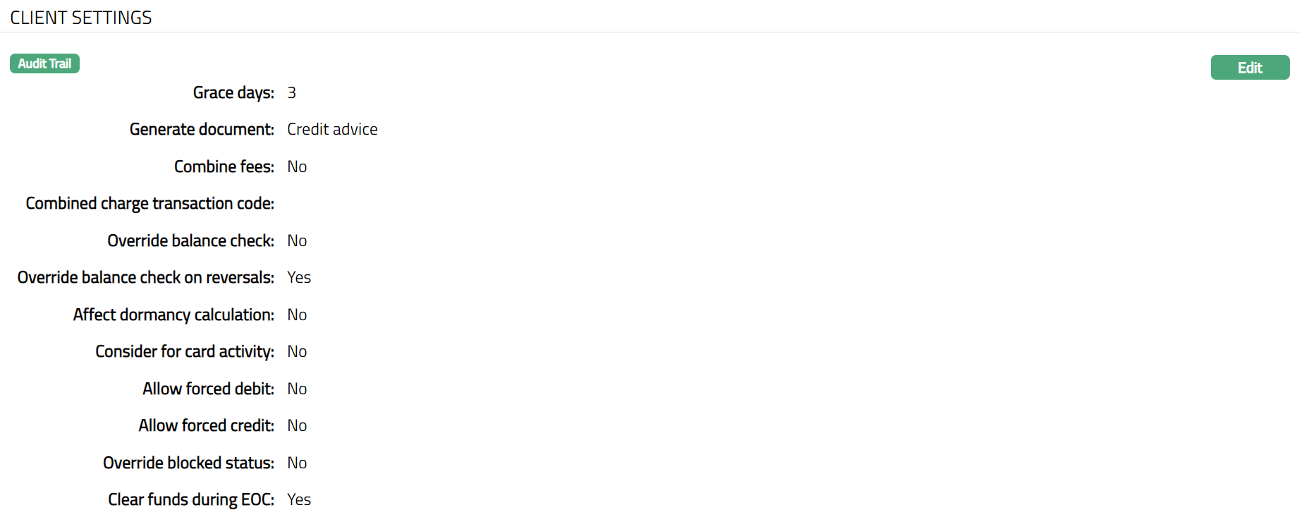 The Client settings tab shows the basic details of the transaction code relating to Client Accounts. This tab appears only when the Transaction type is selected as Client account, during creation of a new Transaction Code.