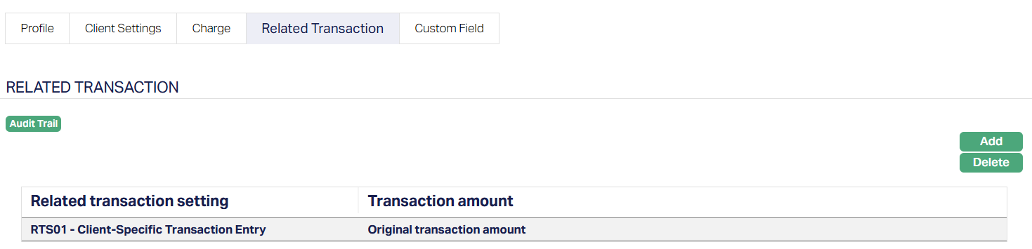 If Transaction type is selected as Client account, the tabs will be Profile, Client Settings, Charge and Custom field.