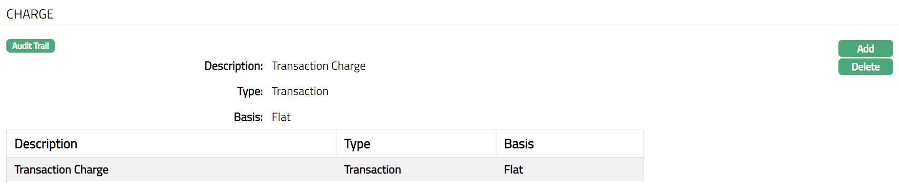 - Access Transaction Code page. Click Add. Add Charge screen appears.