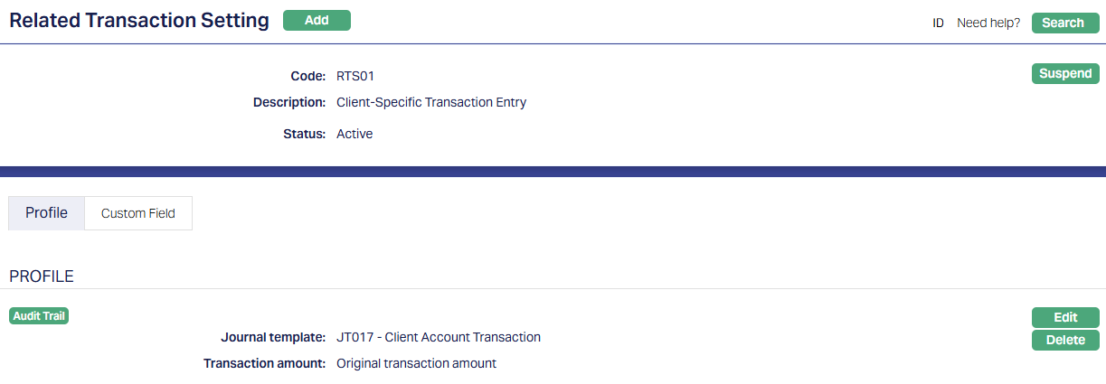 Once you've linked a Related Transaction Setting to a Transaction Code through the Related Transaction tab, Aura will automatically create additional accounting entries whenever you post a transaction using that code.