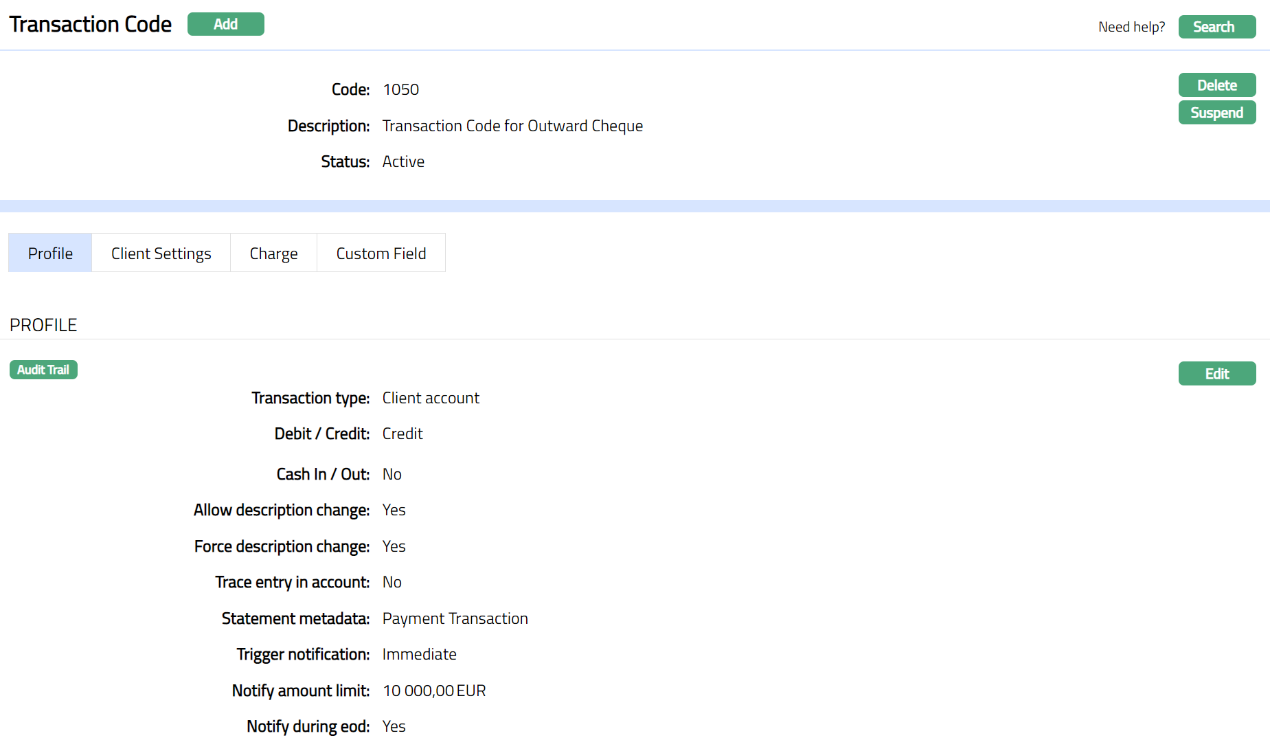 Transaction codes manage the posting of transactions into the accounts. A transaction code identifies a single debit or credit type transaction which will affect either the general ledger or a customer account. Transaction codes provide significant benefits in automation and error reduction. The code specifies whether a transaction is a debit or credit - there is no need for bank user to specify this when entering a transaction. The code specifies whether it is to be applied to a GL or a client account
