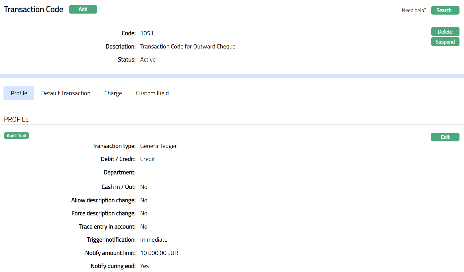 If Transaction type is selected as General ledger, the tabs will be Profile, Default Transaction, Charge and Custom field.
