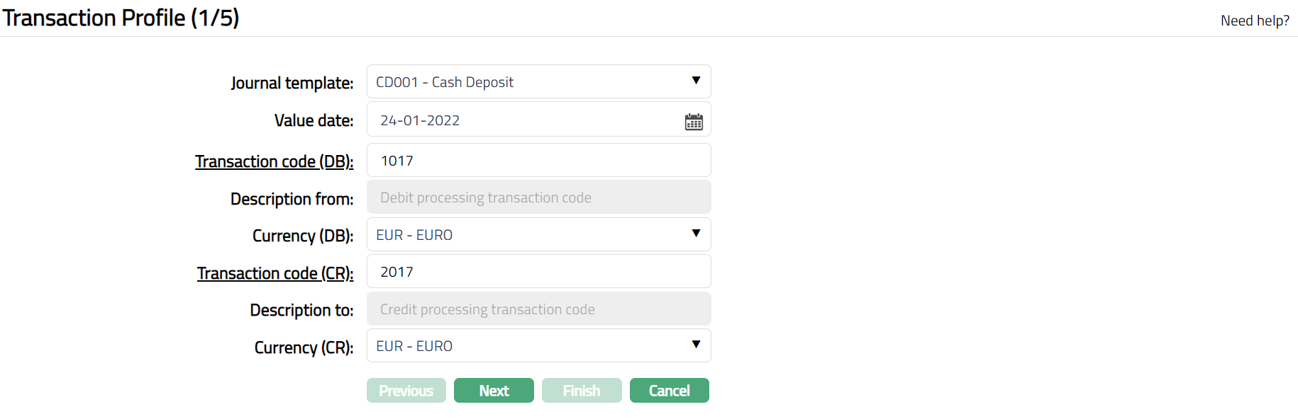 Select Currency (DB) -- currency to be debited -- from the available drop down. If the transaction type for the Transaction Code (DB) is client account then the account currency is defaulted, and you cannot change the currency.