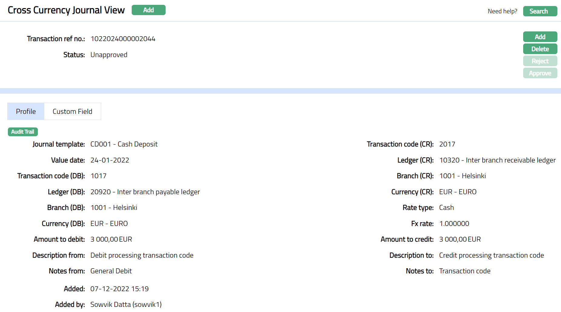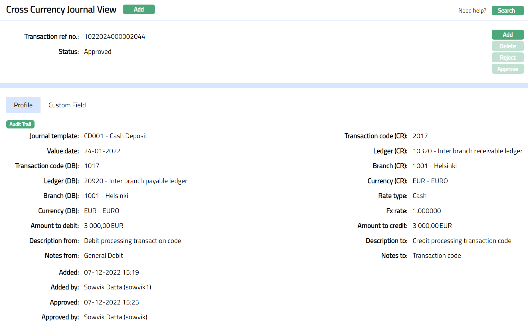 Profile tab, which is the default screen, shows the basic Transaction details entered using Add Cross Currency Journal.