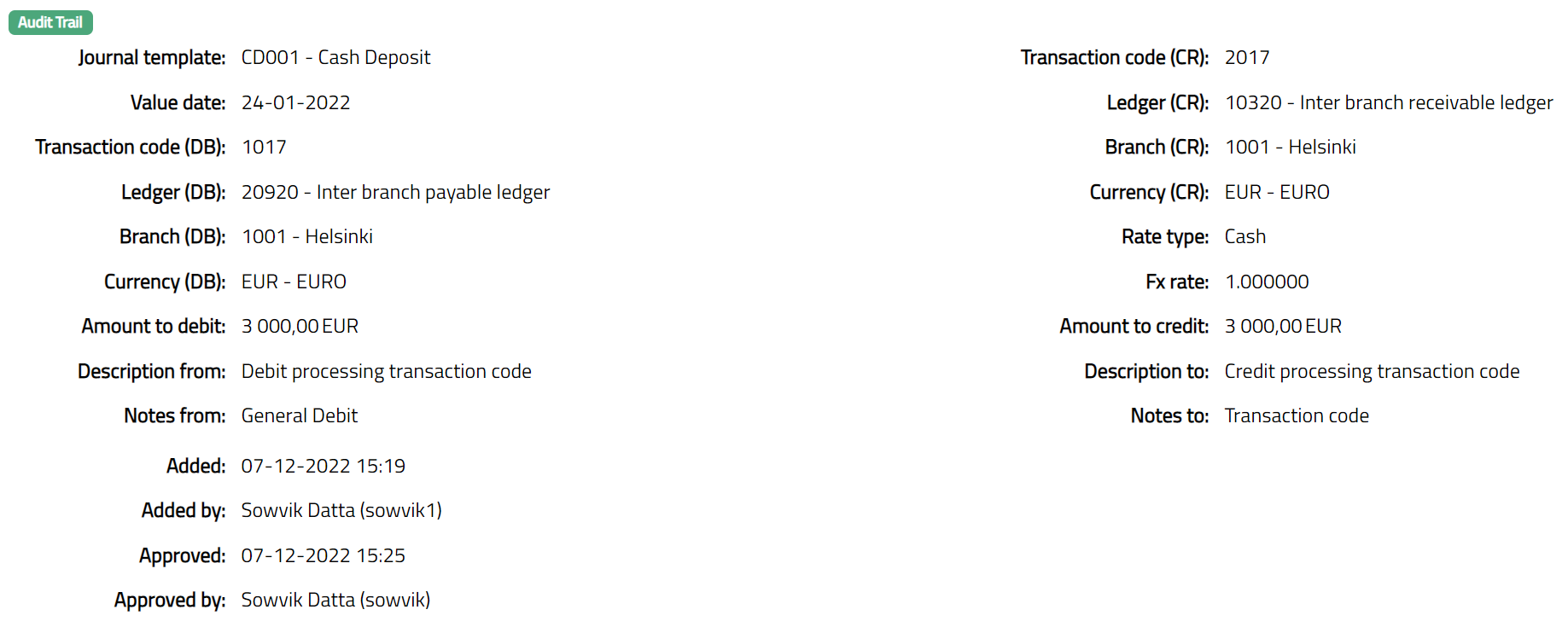 Fx Rate is derived based on the Branch (DB), Currency (DB), Currency (CR) and the Rate type. This will be derived from the currency exchange rate maintained in Aura between these currencies for the rate type specified in the transaction for the Branch (DB). You may modify the rate. Aura validates that the exchange rate input is within the negative variance and positive variance specified in the Journal Template.