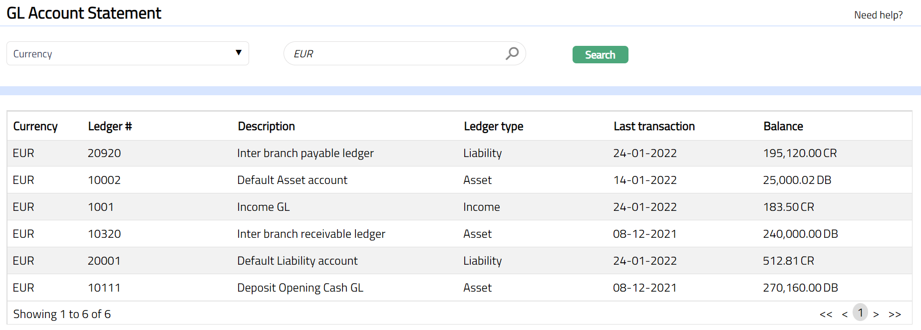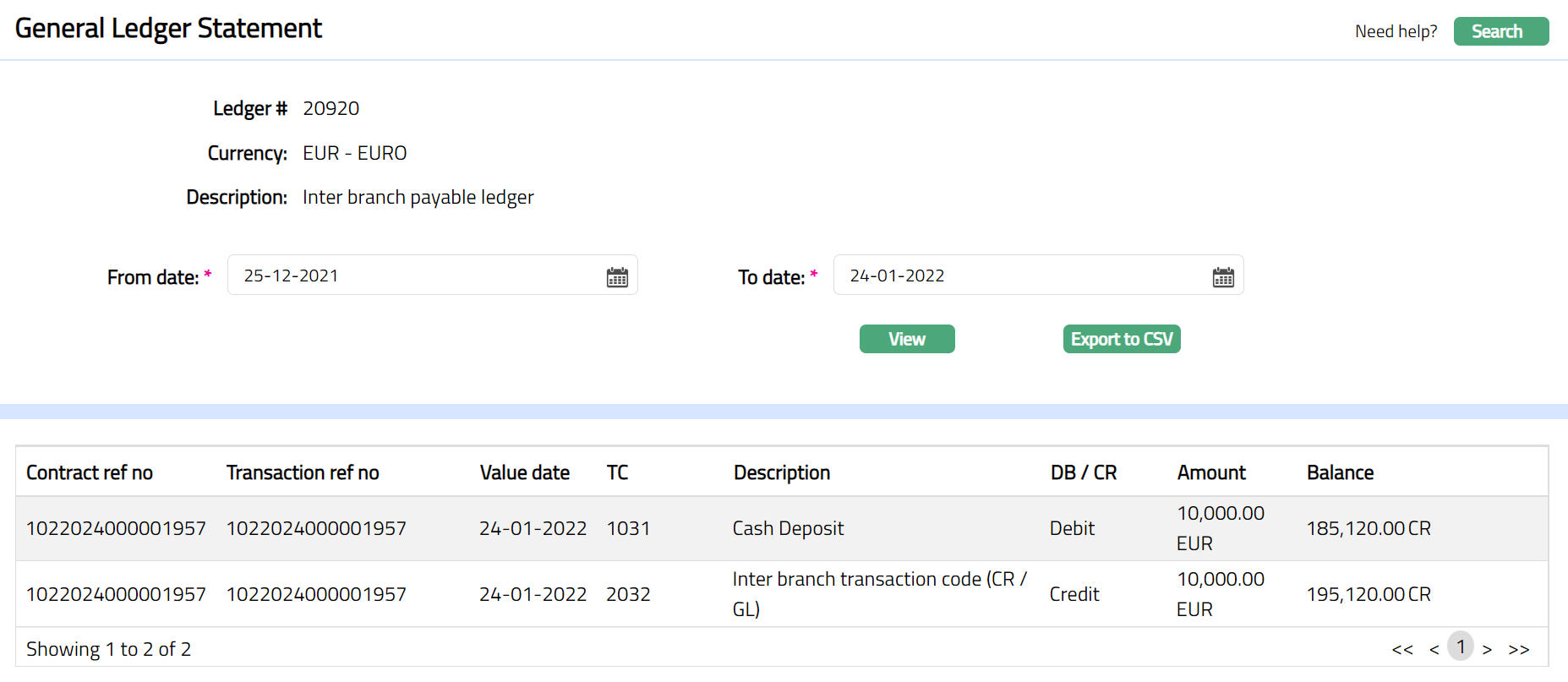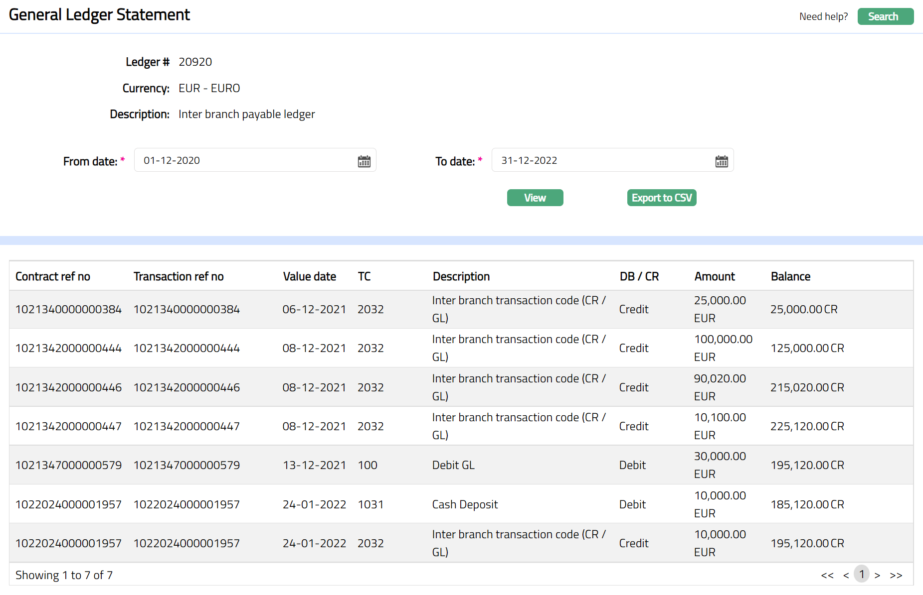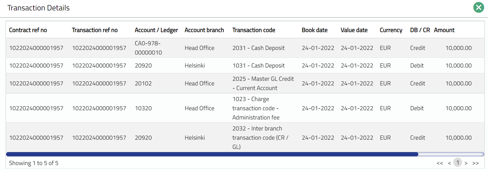- Click any of the records to view transaction details corresponding to the selected record. The details will display all legs (Debits & Credits) corresponding to the selected transaction.