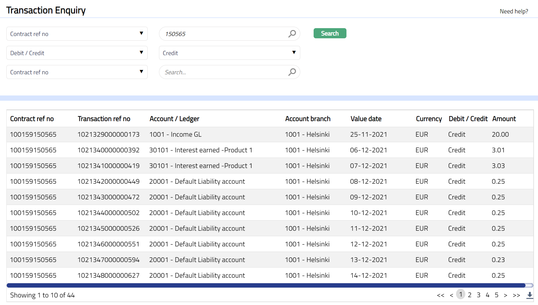 - To view more specific successful transaction records, select an appropriate search input in the textbox provided next to Search button from the available drop-down list, which allows a search by Contract reference number and Credit/Debit. For example, select Contract ref no from the Search box from the available drop-down list and enter 100159150565 in the search text box, then select Credit/Debit from another Search box from the available drop-down list and select any one of the available search parameter Credit or Debit from the drop-down list and click Search. All successful transactions available in Aura which satisfy the search criteria will appear on the page, as shown below: