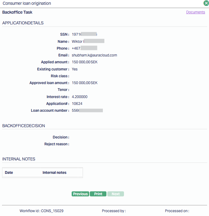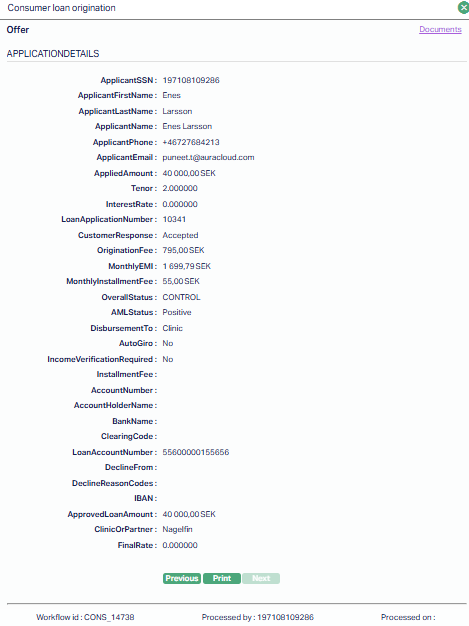 - Offer - Displays the Consumer Loan Origination -- Offer screen, which includes comprehensive applicant details (name, SSN, contact details), loan application number, applied and approved amounts, applicable fees, EMI details, AML status, disbursement method, and other loan parameters.