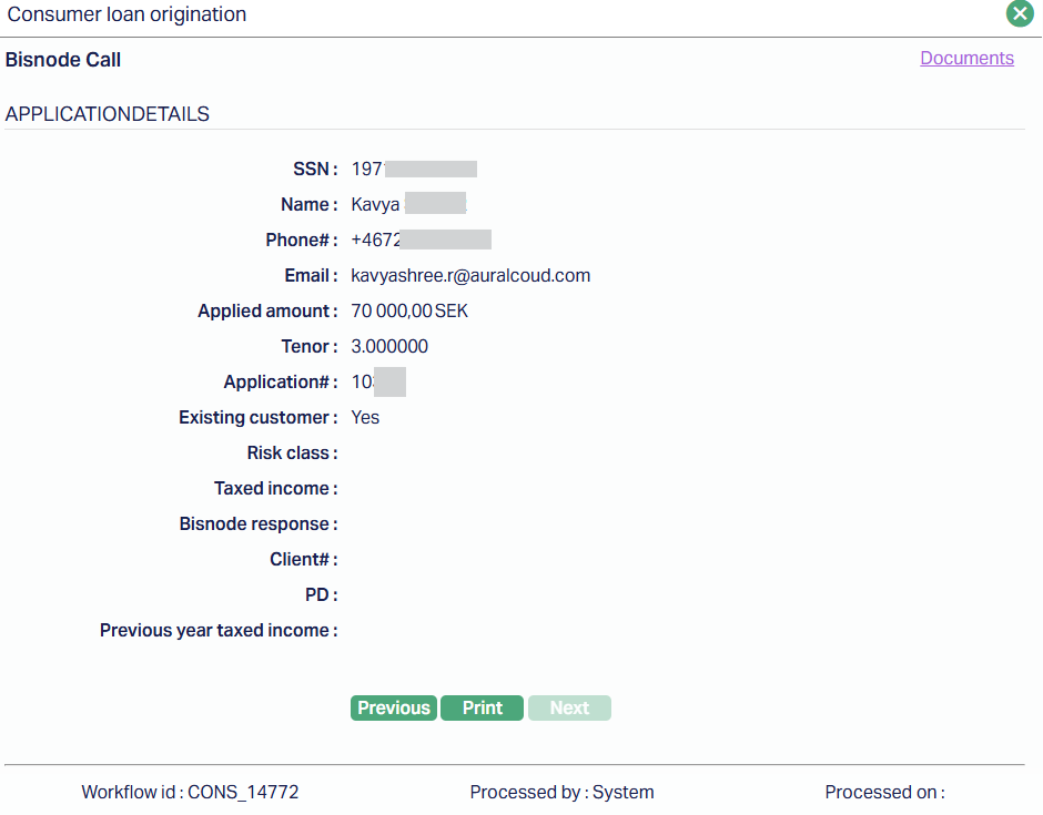 - Bisnode Call - Displays the Consumer Loan Origination -- Bisnode Call screen, showing applicant details, applied amount, tenor, application number, existing customer status, risk class, taxed income, Bisnode response, client number, PD, and previous year's taxed income.