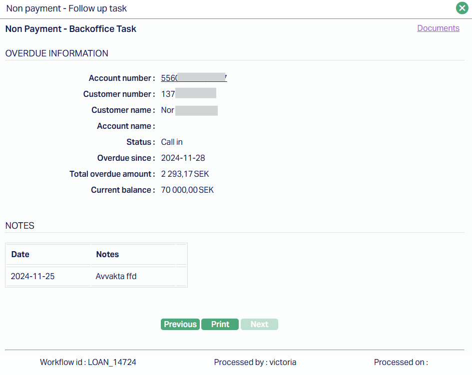 The Notes section lists dated comments from previous follow-ups, while the Documents link provides access to any related attachments.