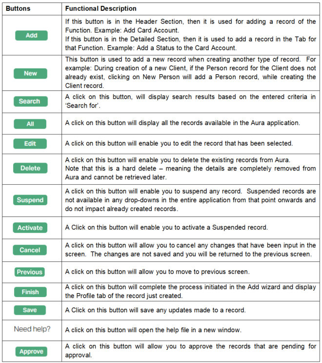 The following table explains a few of the common buttons that you will find in Aura: