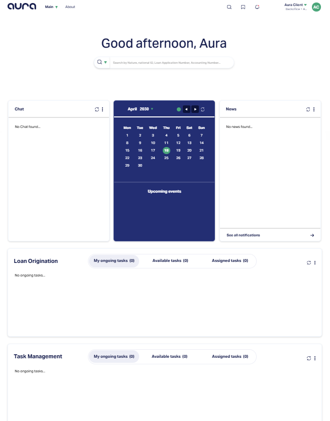 Once a user successfully logs into Aura, the Landing Page is displayed. This screen acts as a dynamic workspace, providing quick access to key tasks, notifications, and communication tools through modular widgets, It is designed to offer a personalized overview of the user's current operational state.