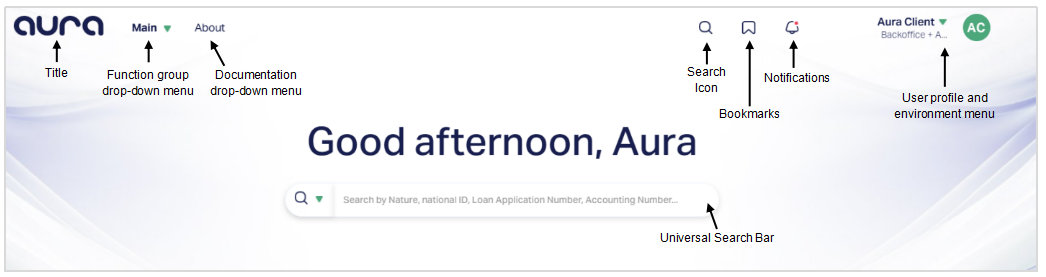 1. Aura Logo (Title): The Aura Logo is displayed at the top-left corner of the screen. Clicking this logo will typically bring you back to the Landing Page, regardless of the module or function you are currently viewing.