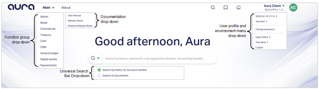 The top navigation bar in Aura provides access to core modules, profile settings, and utilities across the platform.