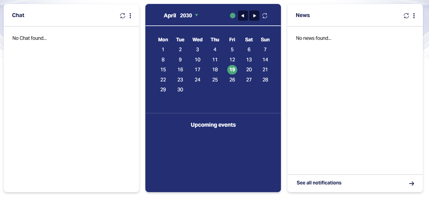 Events shown in this panel are typically tied to workflows, due dates, or assigned system tasks. If there are no upcoming events, the widget will display the message: Upcoming events (with no content listed underneath.