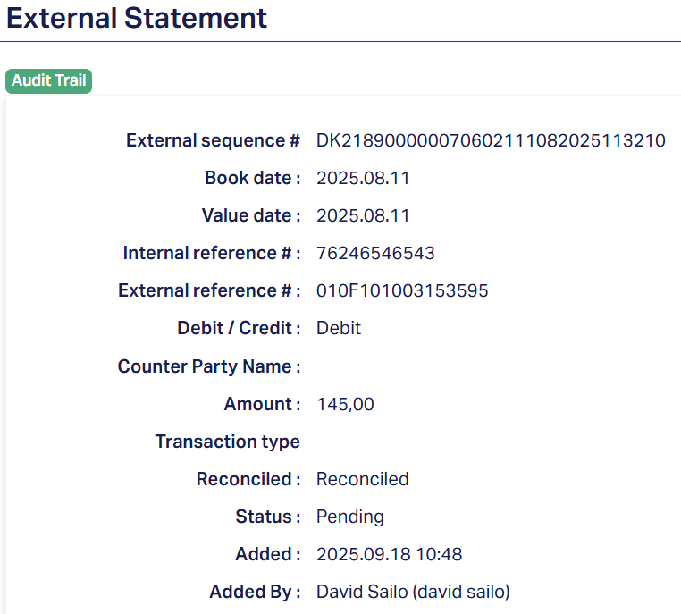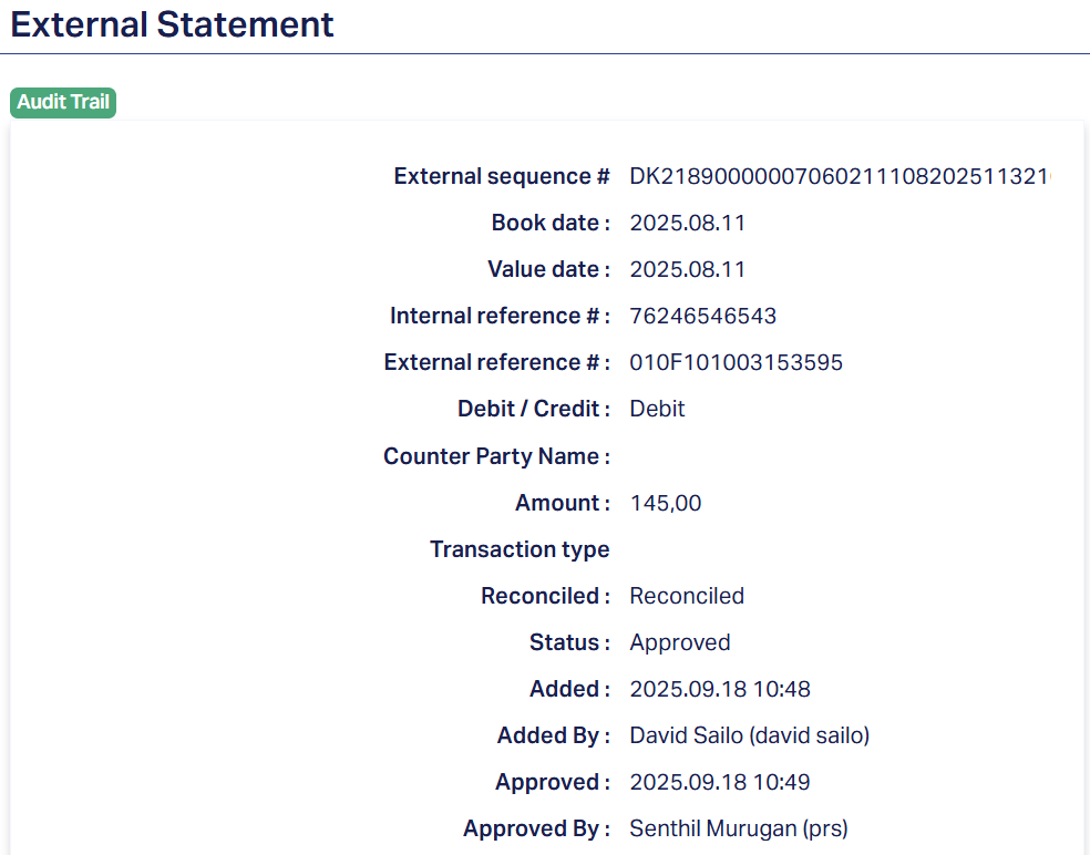 Approved by: It specifies the user or system account (person or automated process) that performed the approval action , that is, who reviewed and marked the transaction as approved. This is part of the audit trail, showing who gave final acceptance of the external statement line.
