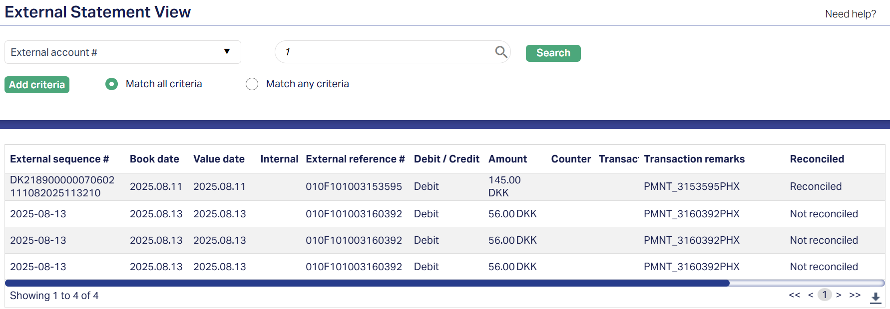 Reconciliation reference #: It specifies the unique reference (or match group id) created when the external line is matched to one or more internal entries; this ID links the external line to the reconciliation record and audit trail (useful for drill-down).