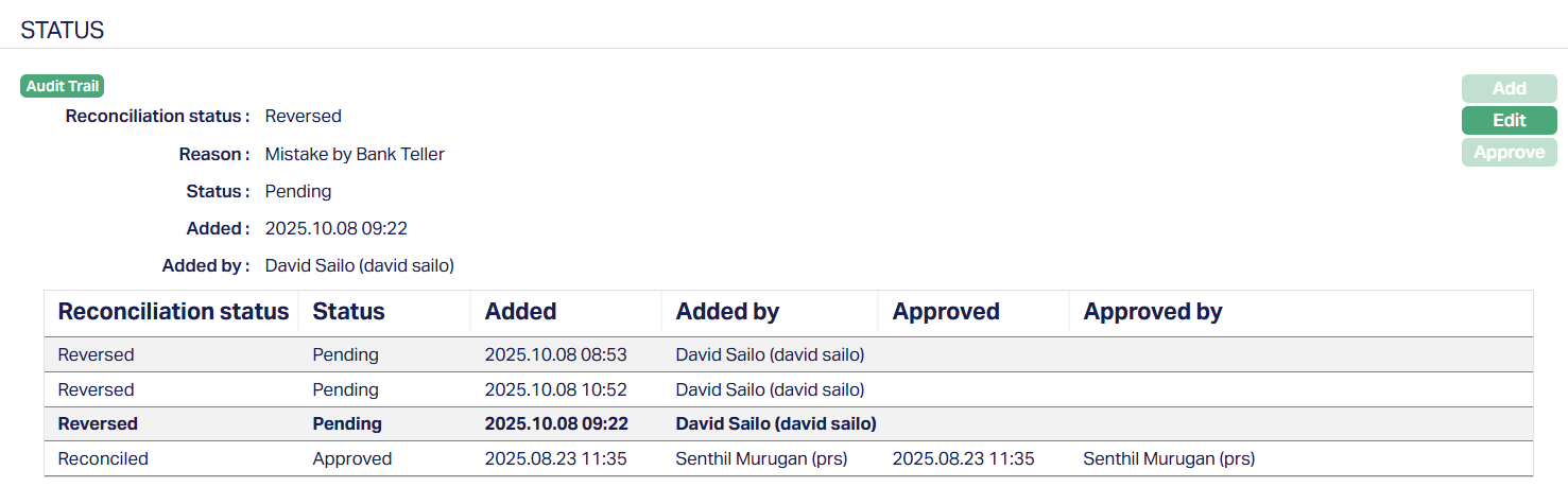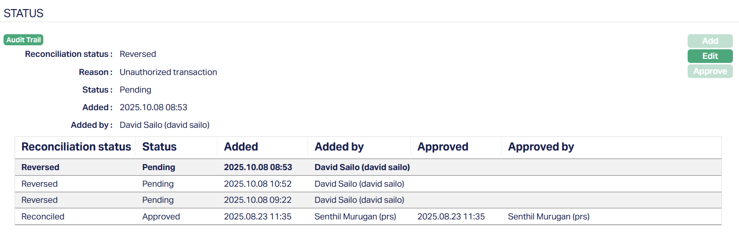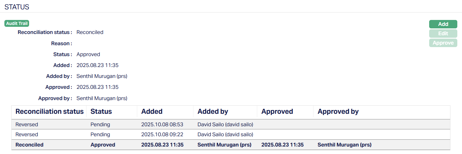 - Reason: It displays the reason for the change of the reconciliation status.
