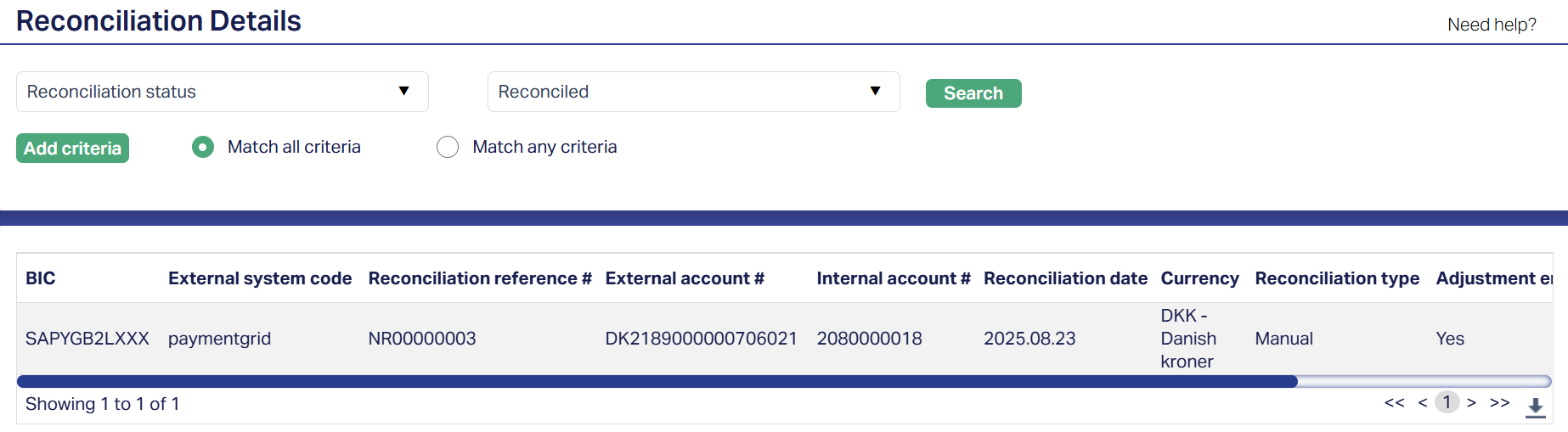 - Adjustment entry: This field indicates if the records you are searching for were given adjustment entries during manual reconciliation. The possible values are Yes or No. Note: During the matching process of Manual Reconciliation, if there is any variance in the amounts between the internal and external account transactions, then Aura would have provided a facility to enter all adjustment entry details, in order to finish the transaction. The Adjustment Entry values for such transactions will be Yes.