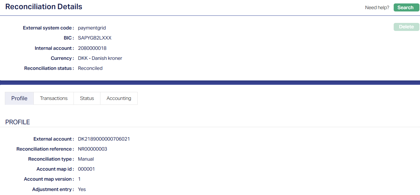 1. Access the Reconciliation Details page and click the Profile tab to view the details as shown below.