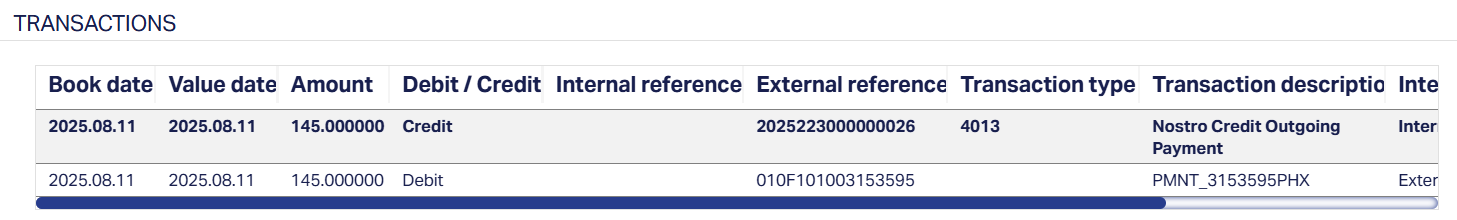 - External reference: It displays the reference number supplied by the correspondent/external system used to uniquely identify the transactions matched against internal reference during automated or manual reconciliation.