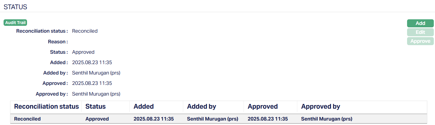 Approve: Approval can be done for those records which have the Reconciliation status as Reconciled and record Status as Pending. Approval can only be done by a user different from the one who added/edited the status. If you want to approve a Reconciled Pending record, then retrieve the record and click Approve. Aura will ask for confirmation. On confirmation, the Reconciliation status will be Reconciled and the record Status will be Approved, as shown below.