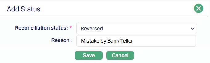 - Reconciliation status: This denotes the current state of the reconciliation entry, and the possible values are Reconciled, Not Reconciled and Reversed.
