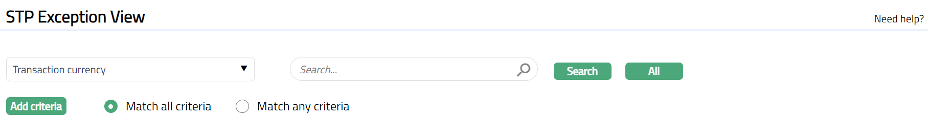 STP exception Search page appears. By default, you will not see any transaction records initially.