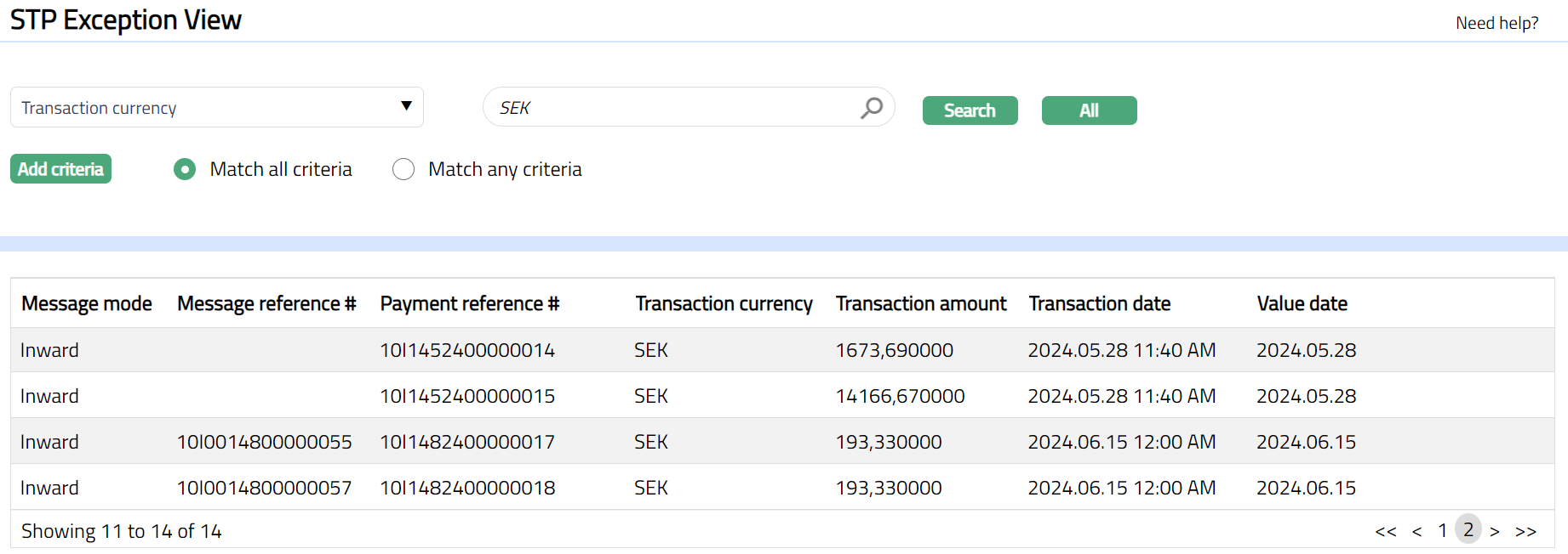 - Click Search. All the Inward records available in Payment Grid that failed for STP, which satisfies the search criteria will appear on the page. A sample is shown below.