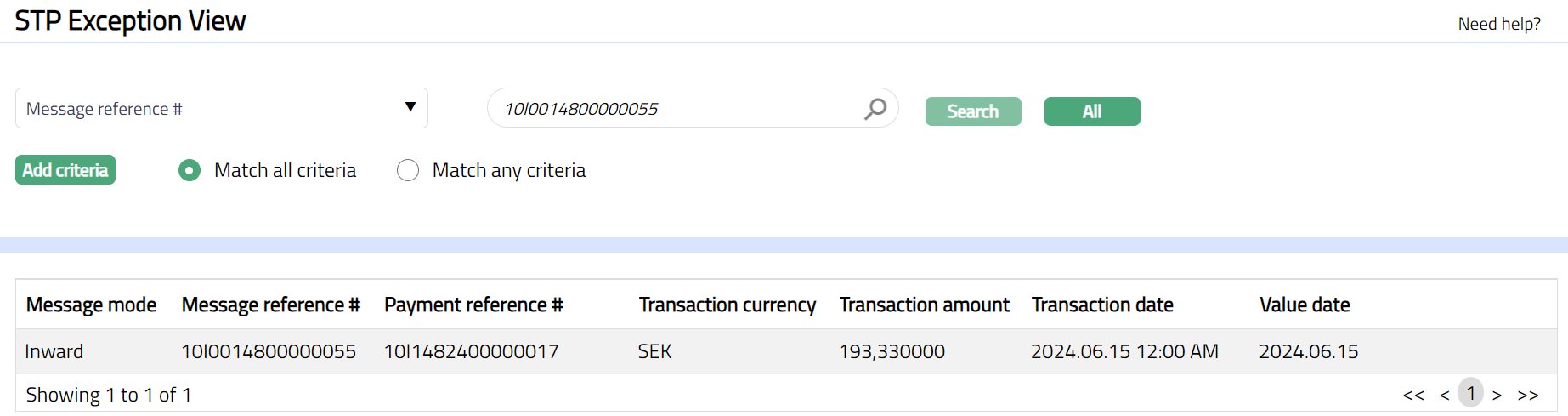 - To search for a transaction, click Search. All the Inward records that failed for STP, available in Payment Grid appears on the page, as shown below.