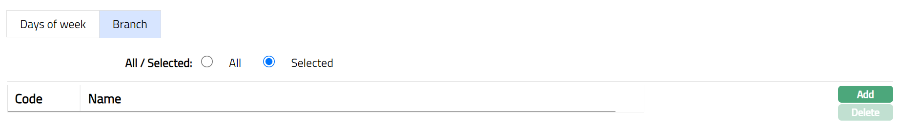 - To restrict the branches for which this Time is available, click Selected radio button. Add button is now enabled.
