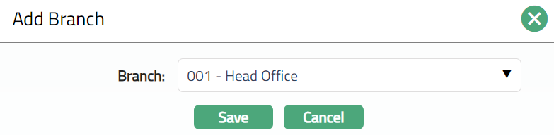 - Click Add. Add Branch screen appears where you can select the required branch from the drop-down list of all active Branches of the Entity.