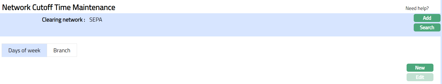 - Click Finish. Network Cutoff Time Maintenance page appears. The new Clearing Network is created, and you can see the Days of Week tab by default.