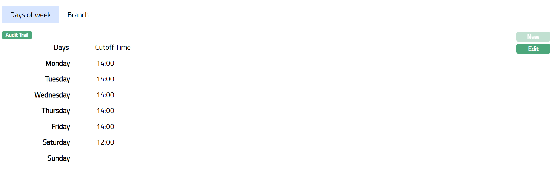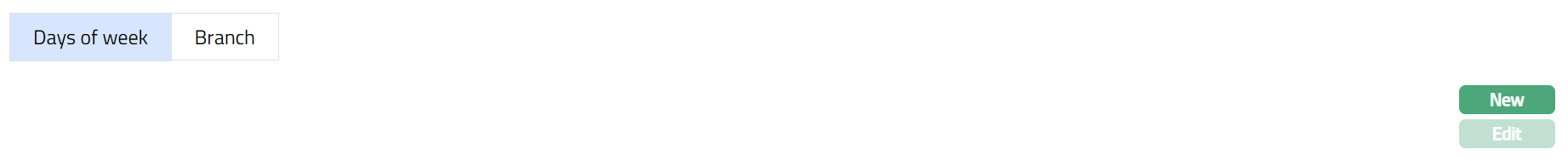 The Branch Tab allows you to define the various Branches to which the cut-off time as maintained in the Days of Week Tab will be applicable.
