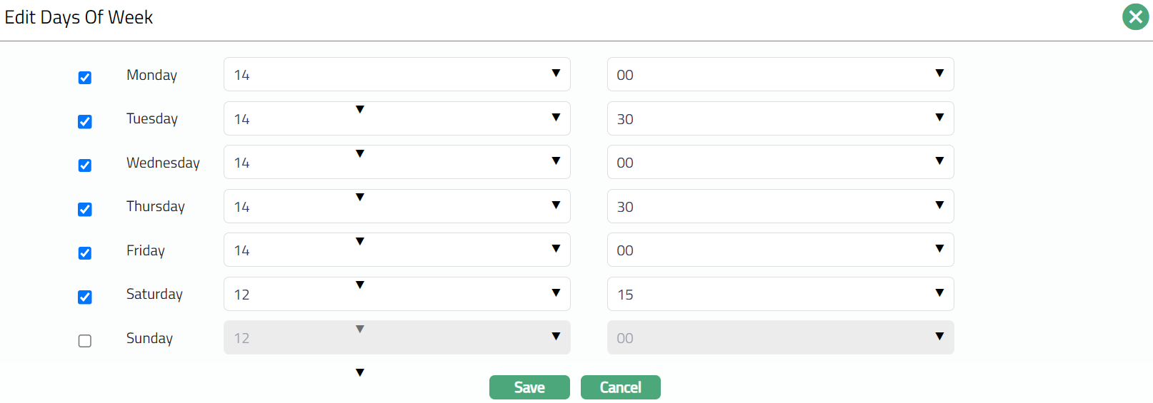 Select checkbox for the required days and select the required cutoff time using the drop-down for hours and minutes.