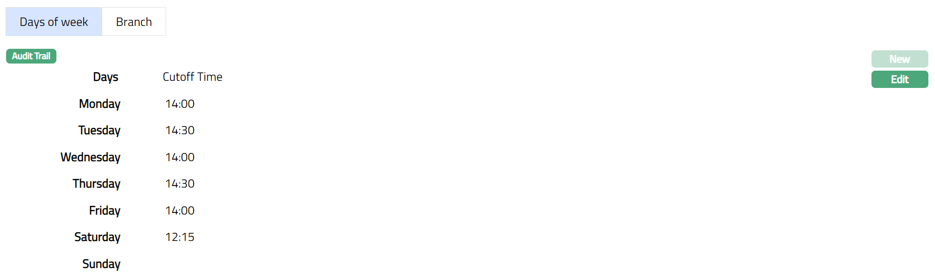- Click New. New days Of Week page appears. You can see all days of the week, with the drop-down for time in HH: MM.