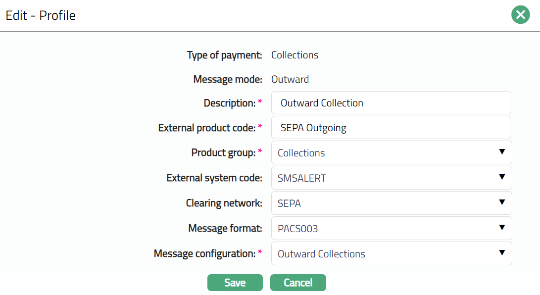 Specify whether Message for an outgoing payment is to be sent either on Payment due date or on Value date. Select the appropriate from the pre-shipped options: Payment date and Value date. The field will be enabled only if Message mode is Outgoing.