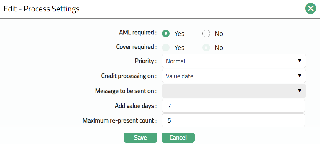 Specify if AML check is required during the processing by selecting Yes or No. If Yes is chosen, then AML (Anti Money Laundering) check will be done and if No is chosen, then AML check will not be done. By default, No is chosen.