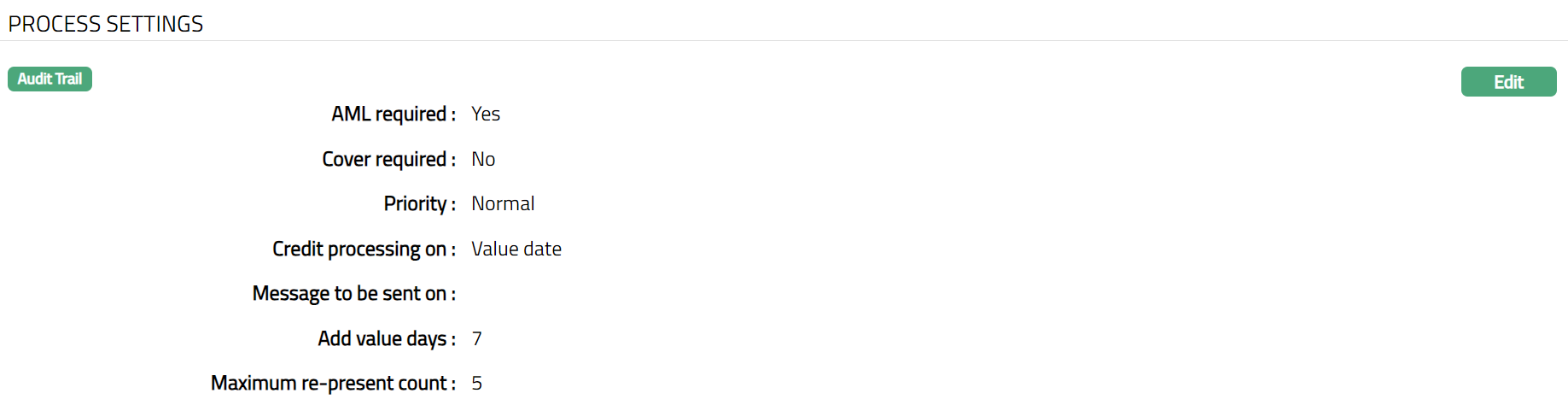 Enter Maximum re-present count. It is the maximum re-present count allowed for Aura to re-present the instrument. On re-presentment, Aura will follow the normal outward collection process. This field will be enabled only when Type of Payment is Collections and Message Mode is Outward.