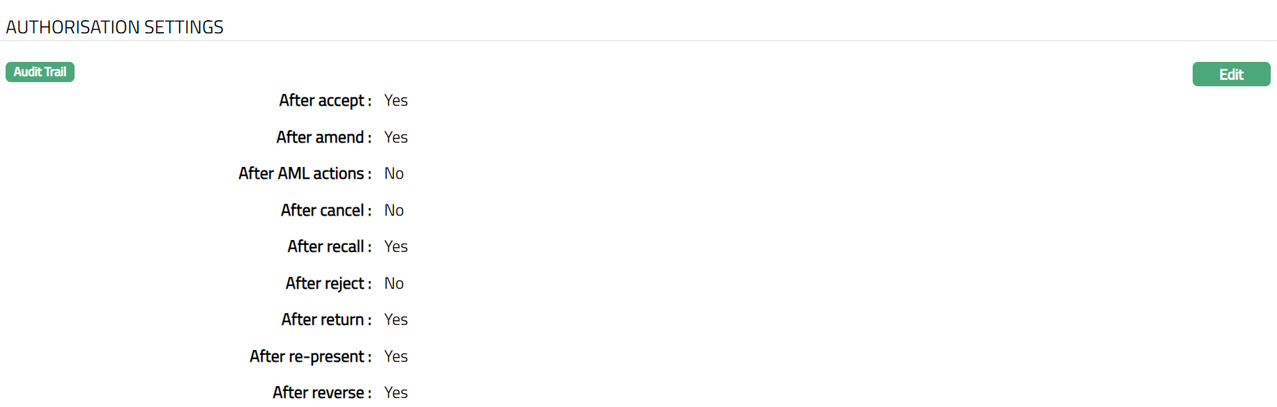 - Click Edit. Edit -- Authorisation Settings page appears.