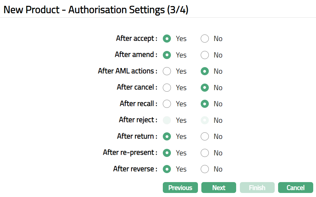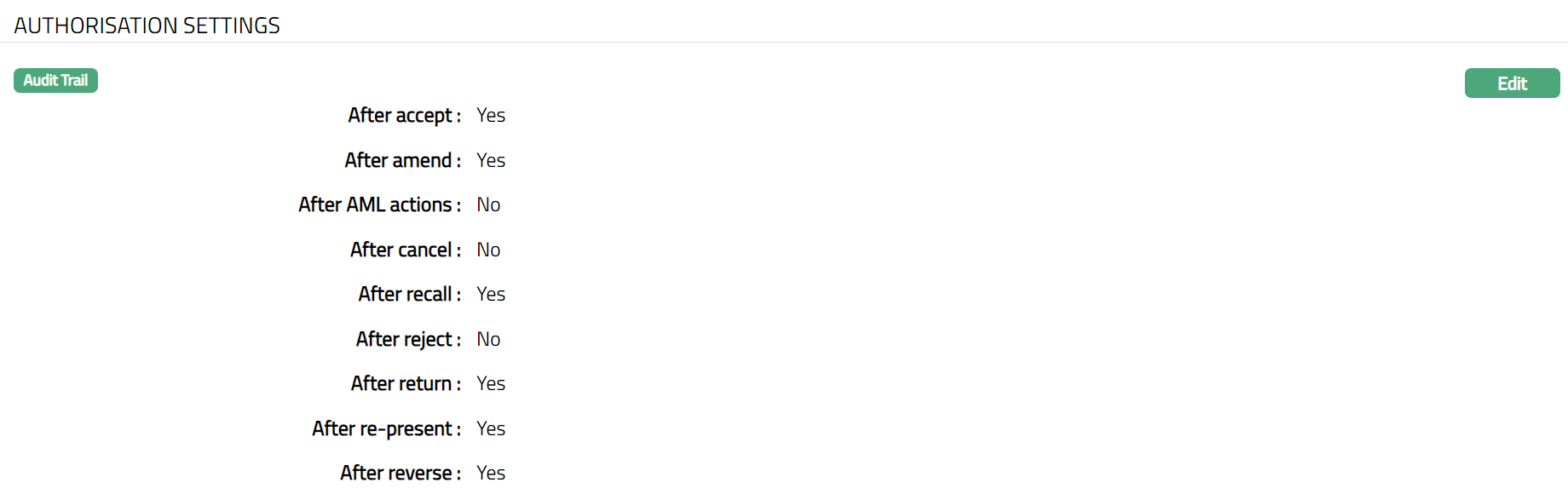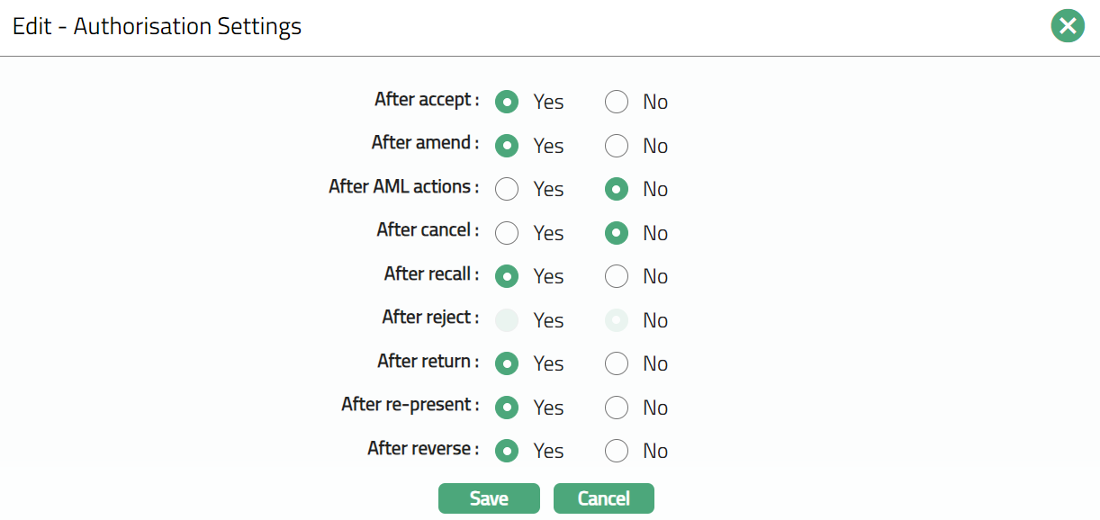 Select Yes or No to specify if an authorisation is required **After accept. **If Yes is chosen, then after the accept event occurs; AURA will wait for authorisation. If No is chosen, then it is assumed as auto authorisation and AURA will move to the next event. By default, No is selected.