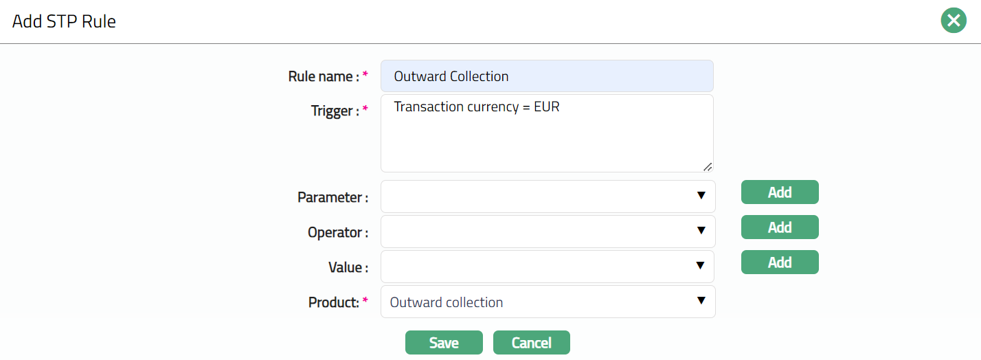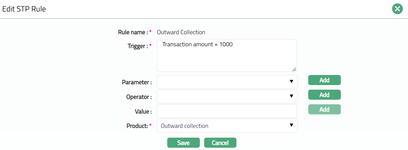 Enter Trigger details. Each trigger will constitute a collection of individual conditions joined by an Operator. The Trigger details can be built using the Parameter, Operator and Value.