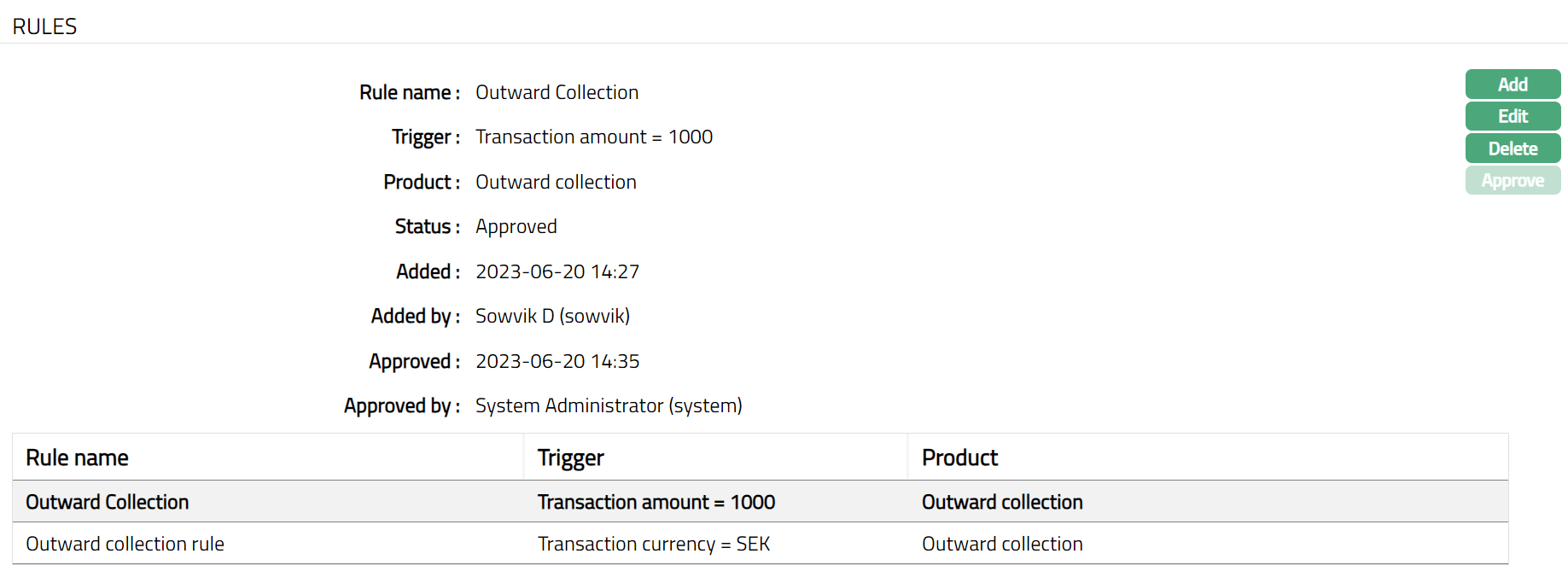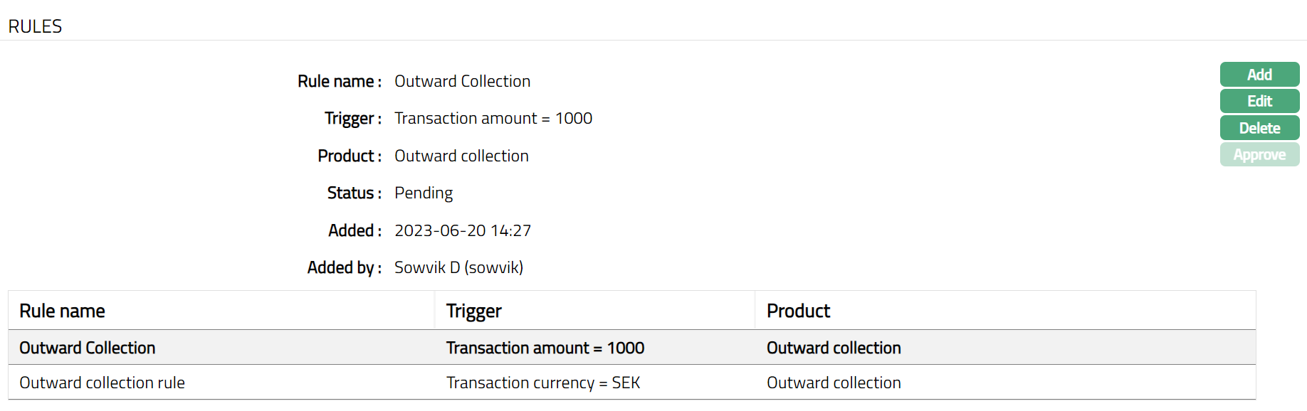 Note: Once Added/ Edited, Status of the Rules tab will be Pending, On Approval, the Status gets changed to Approved.