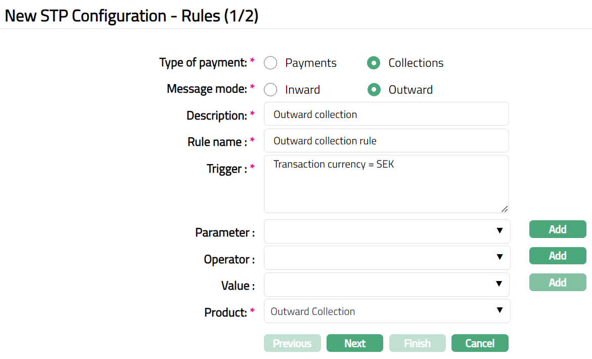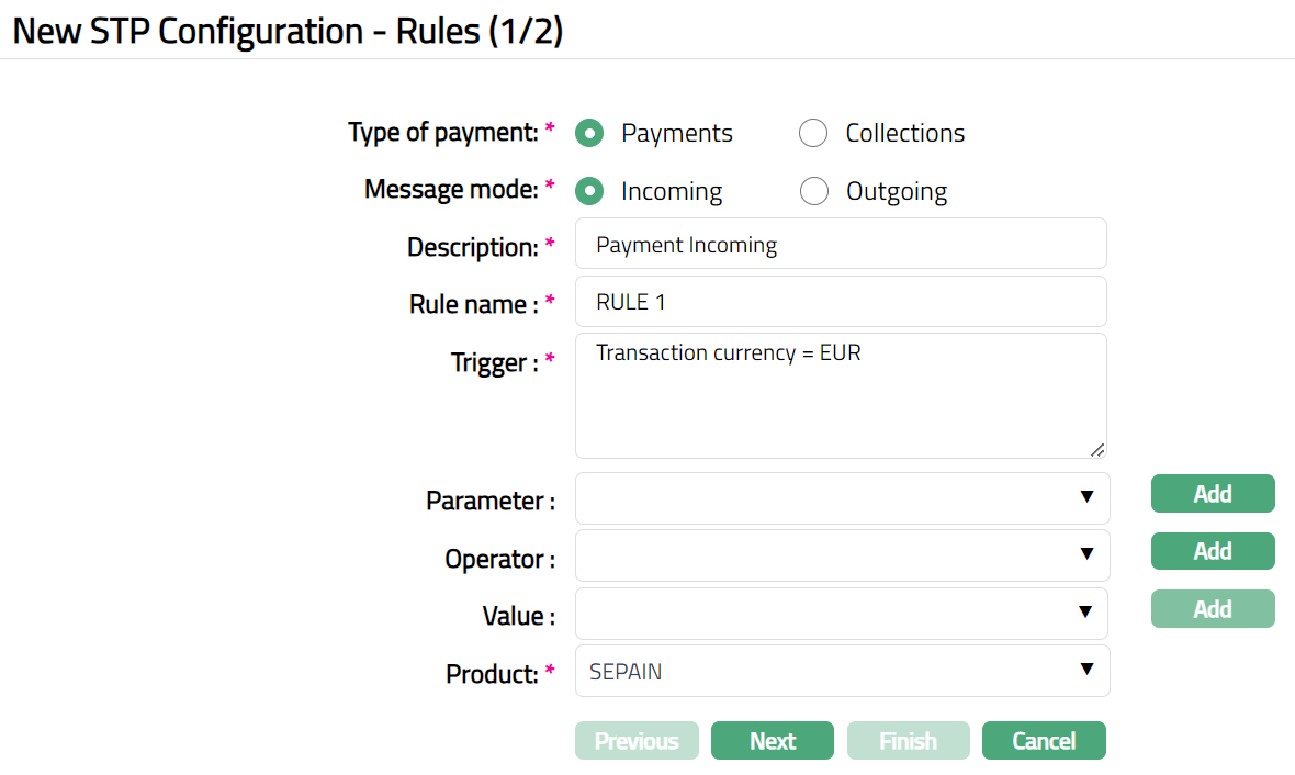 Bank Operation Code: If this parameter is chosen, Value field becomes a text box where you can enter the Bank operation Code. For example: 23B: SPAY is the tag for the Bank Operation Code and SPAY is the code. You can give a trigger as Bank Operation Code = SPAY.