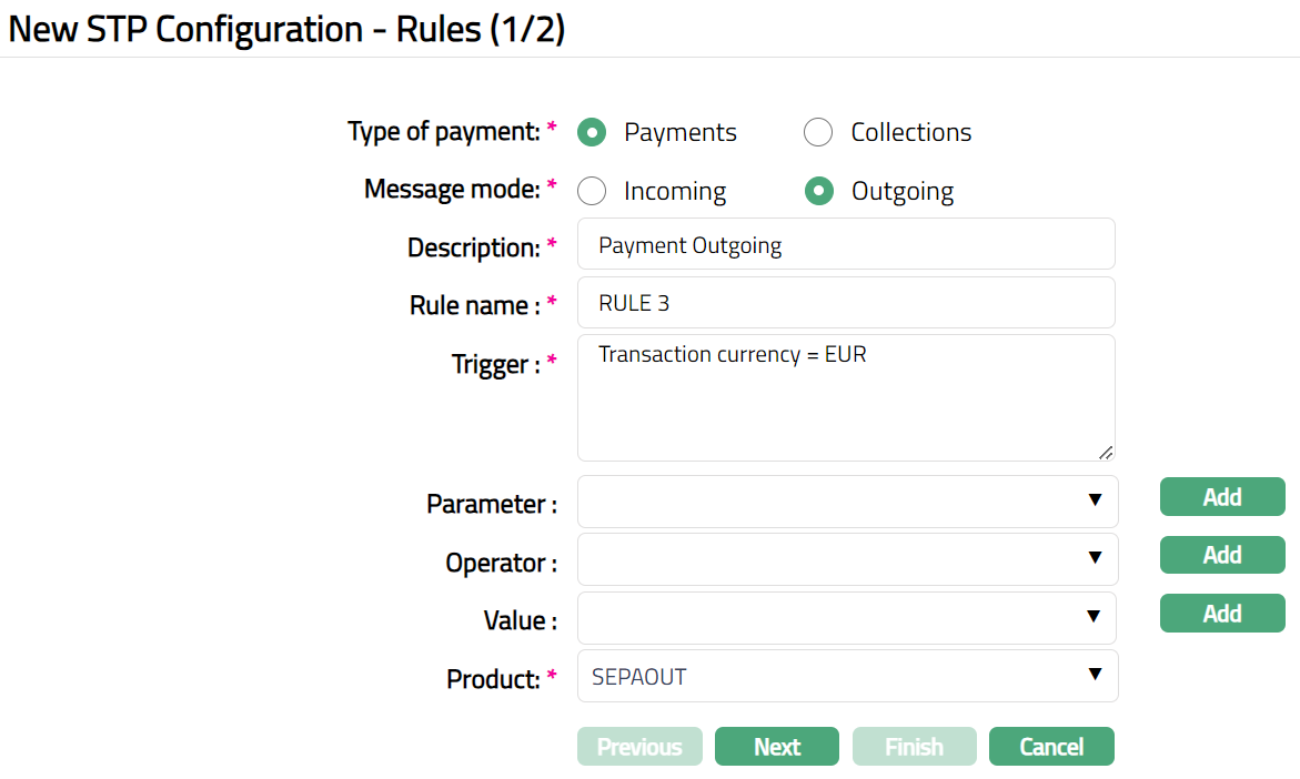 Straight Through Processing (STP) is an essential component of the Payment System. The STP Configuration allows you to provide automatic routing of the payments based on the business rules. Using this functionality, you can set up rules for Incoming and Outgoing payments. Once the rule is satisfied, the Product is picked, and all the settings maintained for the Product will be resolved by CC-PG.