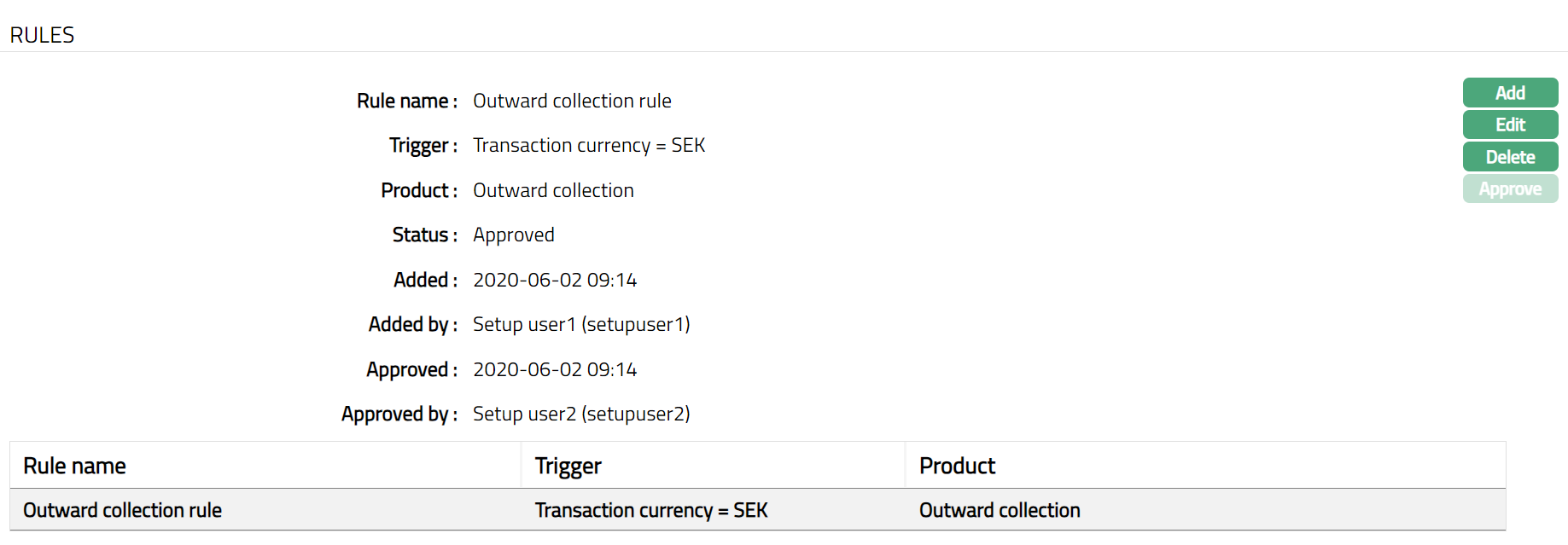 Note: Once edited Status of the tab will be Pending. Only on Approval, the Status gets changed to Approved Only the rule maintained under STP configuration will be updated. Sample Screen shown below.