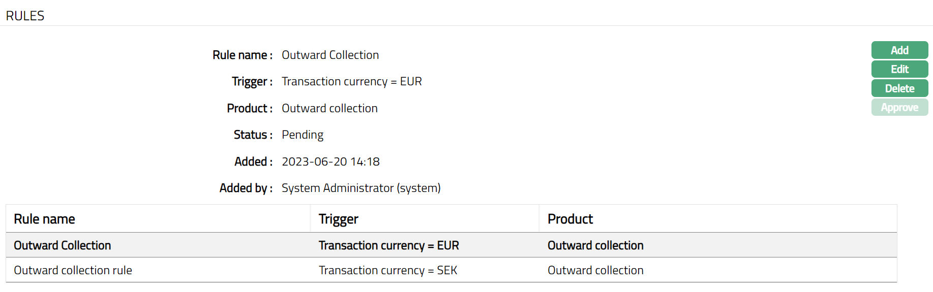 Approve: If you want to approve a rule, then retrieve the record and click on Approve. CC-PG will ask for confirmation. Once the rule is approved, status gets changed from Pending to Approved.